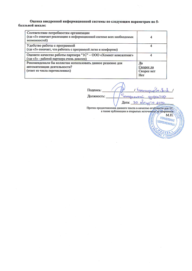 Проект перехода на новую учетную систему выполнялся по технологии быстрого внедрения: сотрудники «Управление Сбережениями» внедряли основные блоки системы самостоятельно по заранее согласованному графику. Согласно графику, специалистами ГК «Хомнет» выполнялся контроль корректности учета по промежуточным точкам и консультационная поддержка сотрудников Заказчика в процессе работы с системой. В рамках проекта ГК «Хомнет» показала пользователям особенности работы со своим продуктом и продолжает выполнять информационно-техническое сопровождение работы в программе (по договору ИТС).