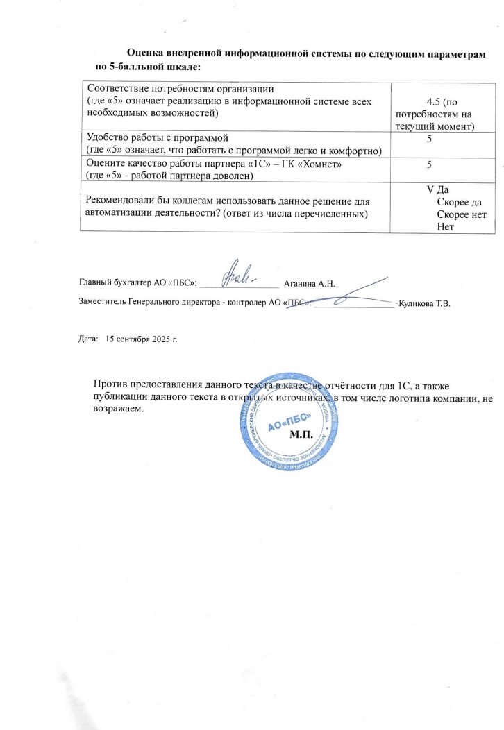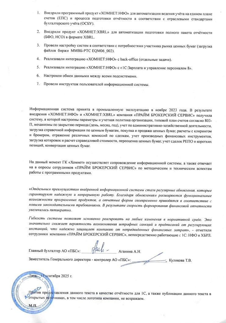 Информационная система принята в промышленную эксплуатацию. В результате внедрения «ХОМНЕТ:НФО» и «ХОМНЕТ:XBRL» компания «ПРАЙМ БРОКЕРСКИЙ СЕРВИС» получила систему, в которой настроены параметры и учетная политика организации, типовой план счетов согласно 803-П, механизмы по закрытию периода (день, месяц, год), учет по административно-хозяйственной деятельности, загрузка справочной информации по ценным бумагам, покупка и продажа ценных бумаг, расчеты с клирингом и брокером, отражение различных комиссий по сделкам, учет производных финансовых инструментов, загрузка котировок и расчет справедливой стоимости, переоценка ценных бумаг, учет сделок РЕПО и коротких позиций, конвертация ценных бумаг.