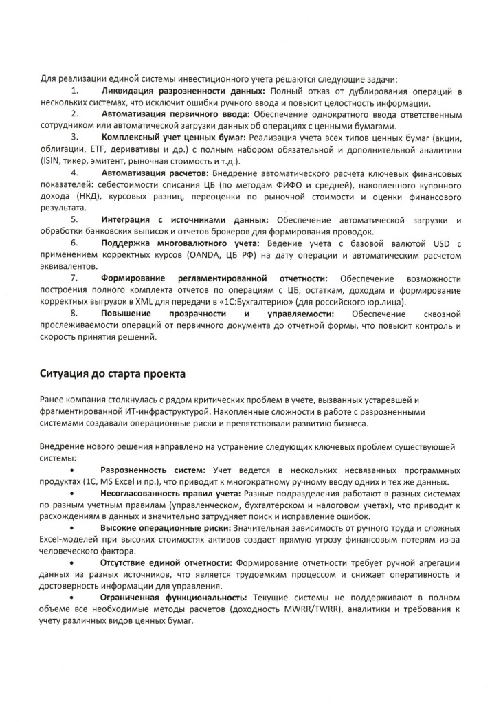 Бизнес-критерий успеха проекта — достижение такого уровня автоматизации учета операций с инвестиционными вложениями (ценные бумаги, недвижимость, драгметаллы), при котором все ключевые процессы (от первичного ввода данных до формирования отчетности) выполняются в режиме, близком к реальному времени, с минимальным ручным вмешательством. Это позволит минимизировать операционные и финансовые риски, повысить достоверность данных для принятия управленческих решений и обеспечить соответствие регуляторным требованиям.