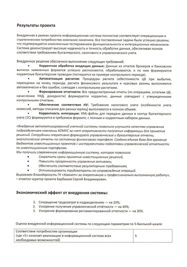 «Внедрение автоматизированной учетной системы позволило улучшить качество управления подразделением компании КОМУС за счет оперативности получения информации для принятия решений. Сотрудники оперативно формируют управленческие и бухгалтерские отчеты, аналитические отчеты по состоянию финансового портфеля. Создана единая база для хранения бюджетов инвестиционных проектов с инструментами подготовки управленческой отчетности по инвестиционным портфелям.