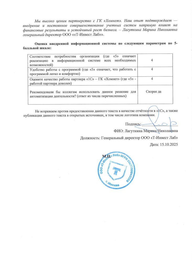 Мы высоко ценим партнерство с ГК «Хомнет». Наш опыт подтверждает — внедрение и постоянное совершенствование учетных систем напрямую влияет на финансовые результаты и устойчивый рост бизнеса. – Лагуткина Марина Николаевна, генеральный директор ООО «Т-Инвест Лаб».