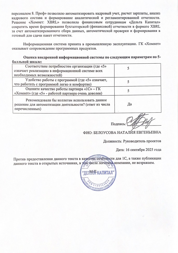Благодаря внедрению «Хомнет:НФО» автоматизировано ведение учёта на едином плане счетов (ЕПС) и процесс подготовки отчётности в соответствии с отраслевыми стандартами бухгалтерского учёта (ОСБУ). Внедрение «1С:Зарплата и управление персоналом 8. Проф» позволило автоматизировать кадровый учет, расчет зарплаты, анализ кадрового состава и формирование аналитической и регламентированной отчетности. Решение «Хомнет:XBRL» позволило финансовым сотрудникам «Дельта Капитал» сократить время формирования бухгалтерской (финансовой) отчетности в формате XBRL за счет автоматизированного сбора данных, автоматической проверки и формирования в готовый для сдачи пакет отчетности.