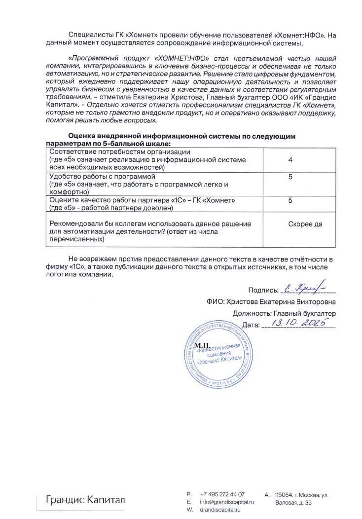 Инвестиционная компания «Грандис Капитал» внедрила «ХОМНЕТ:НФО»